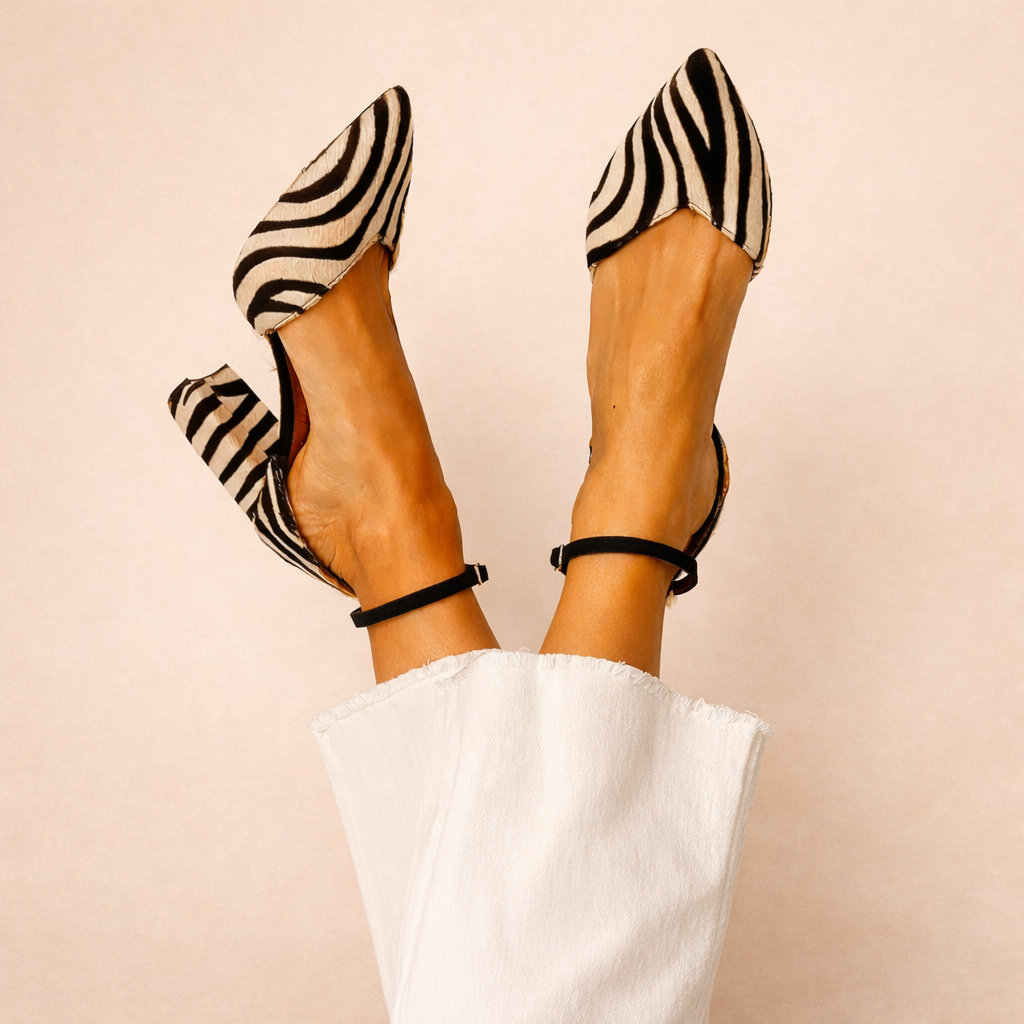 Las sandalias son perfectas para quienes desean destacar sin renunciar al confort. Su patrón inspirado en la cebra, combinado con una correa femenina al tobillo y un tacón estable, crea un equilibrio ideal entre estilo audaz y elegancia sofisticada. Una pieza versátil que funciona tanto de día como de noche.